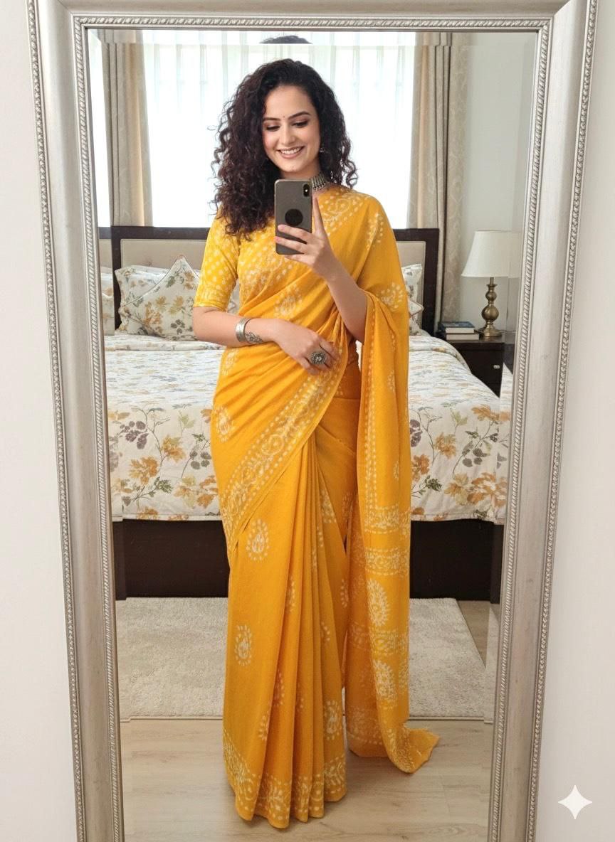 *Pure Chanderi Soft Cotton Hand Block Batik Printed Saree with Blouse Piece*